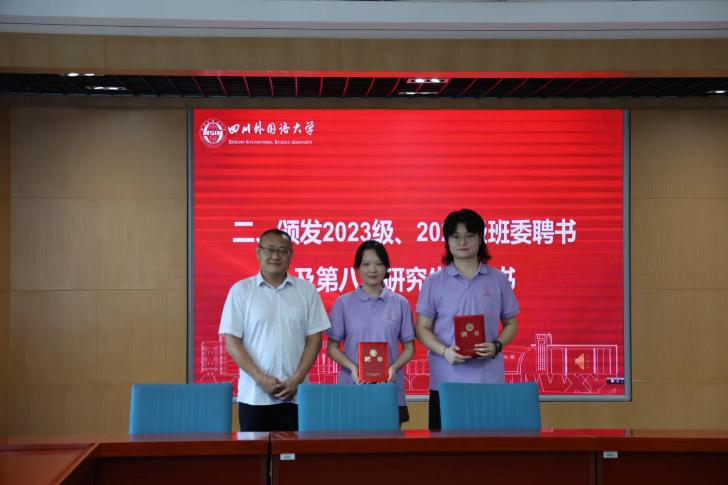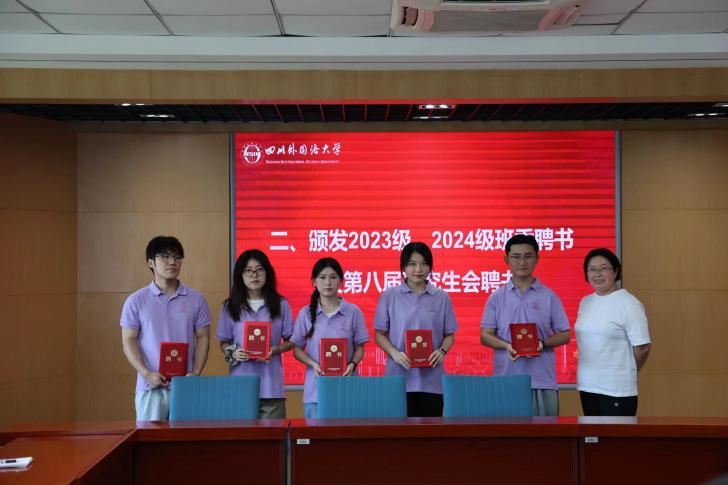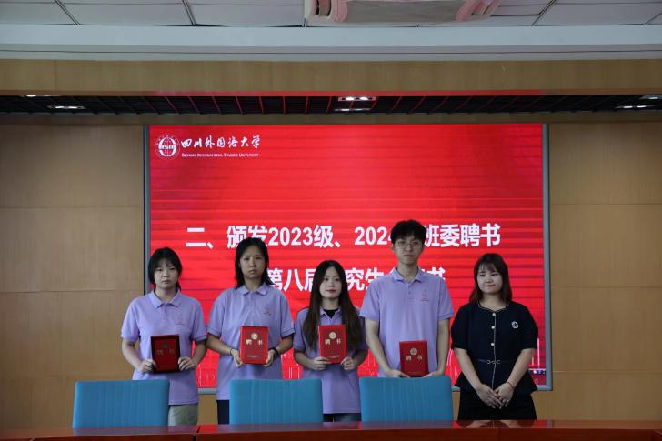 大会进入了隆重的聘书颁发环节。崔光军书记为第八届研究生会主席团成员颁发聘书;徐艳老师为第八届研究生会全体学生干部授予聘书;王雨潇老师为2023级、2024级马理论1班班委发放聘书。学院老师们也为全体学生骨干送上了对未来的祝福,希望他们在接下来的学习和生活中也能够不忘初心、砥砺前行。