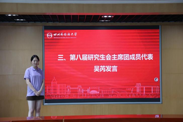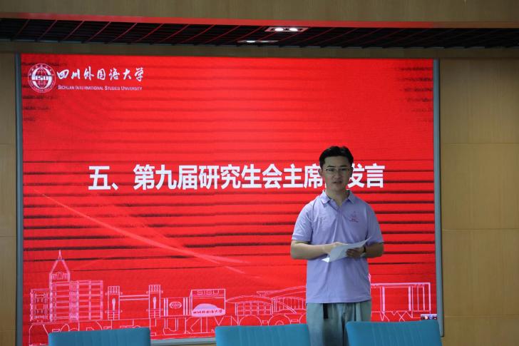 第九届研究生会主席团成员代表杨梓罡同学发言,首先向第八届研究生会成员的辛勤付出致以诚挚的感谢。他期望第九届研究生会成员能以第八届研究生会成员的风采为榜样,以身作则、勇于担当、积极进取。他坚信,第九届研究生会必将承前启后,交出一份让师生满意的答卷。