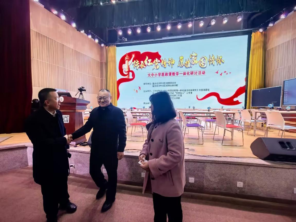 1121日上午,沙坪坝区大中小学思政教育一体化研讨会在重庆一中天星桥中学学术厅顺利举行。本次会议由沙坪坝区教师进修学院思政课研讨组组织,以"传承红岩精神 厚植家国情怀"为主题,沙坪坝区中小学分管校长及思政课教师代表参会。我院由党总支书记崔光军带队,师生代表一行参与本次研讨交流。