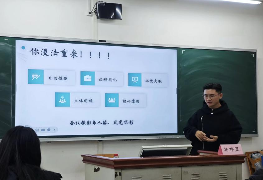 为持续加强学院新闻宣传队伍建设,进一步提升全院研究生新闻宣传工作水平,我院于10月31日下午在歌乐楼B505成功举办了一场别开生面的摄影技能专题分享会。本次活动特邀我院朋辈导师——2024级研究生杨梓罡担任主讲,2025级马克思主义理论1班全体同学参加。