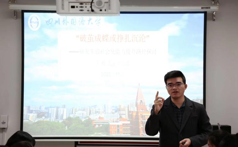 为了引导我院研究生掌握人际沟通技巧、学会情绪管理与冲突化解,助力其构建健康和谐的人际网络,11月3日上午,我院于立德楼B503开展“研究生的社会化能力提升路径探讨”思索沙龙。本次讲座邀请日语学院研究生辅导员曾贵担任主讲,我院全体研究生参加。