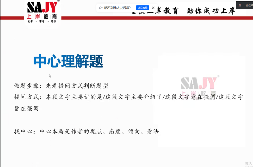 在培训中,曹老师系统讲授了中心理解题的解题技巧,从题型判断到中心句提取,对各类方法逐一拆解,指导学员运用主题词、关联词等标志性词语精准把握文段重点,深入领会作者行文逻辑。随后通过例题实训,进一步强化了解题思路,有效提升了学员的实践应用能力。