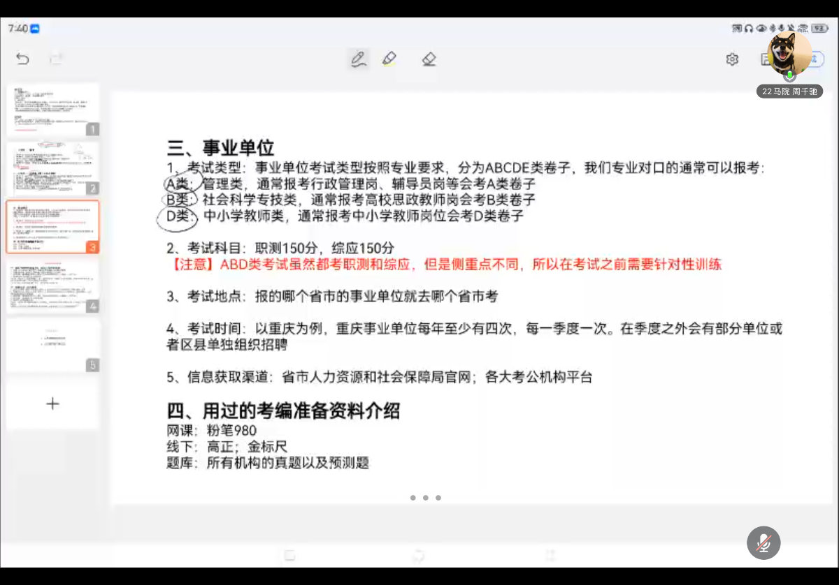 周千驰学姐结合自身经历,从体制内外就业路径、考编考公策略、非编工作选择及求职心态四个方面展开分享。她详细讲解了公务员国考与选调生考试的时间、科目、题型及信息获取渠道,并系统介绍了事业单位的考试类型,指出马理论专业通常对口A类(管理类)、B类(社会科学专技类)和D类(中小学教师类),提醒同学们应针对不同类别进行专项准备。
